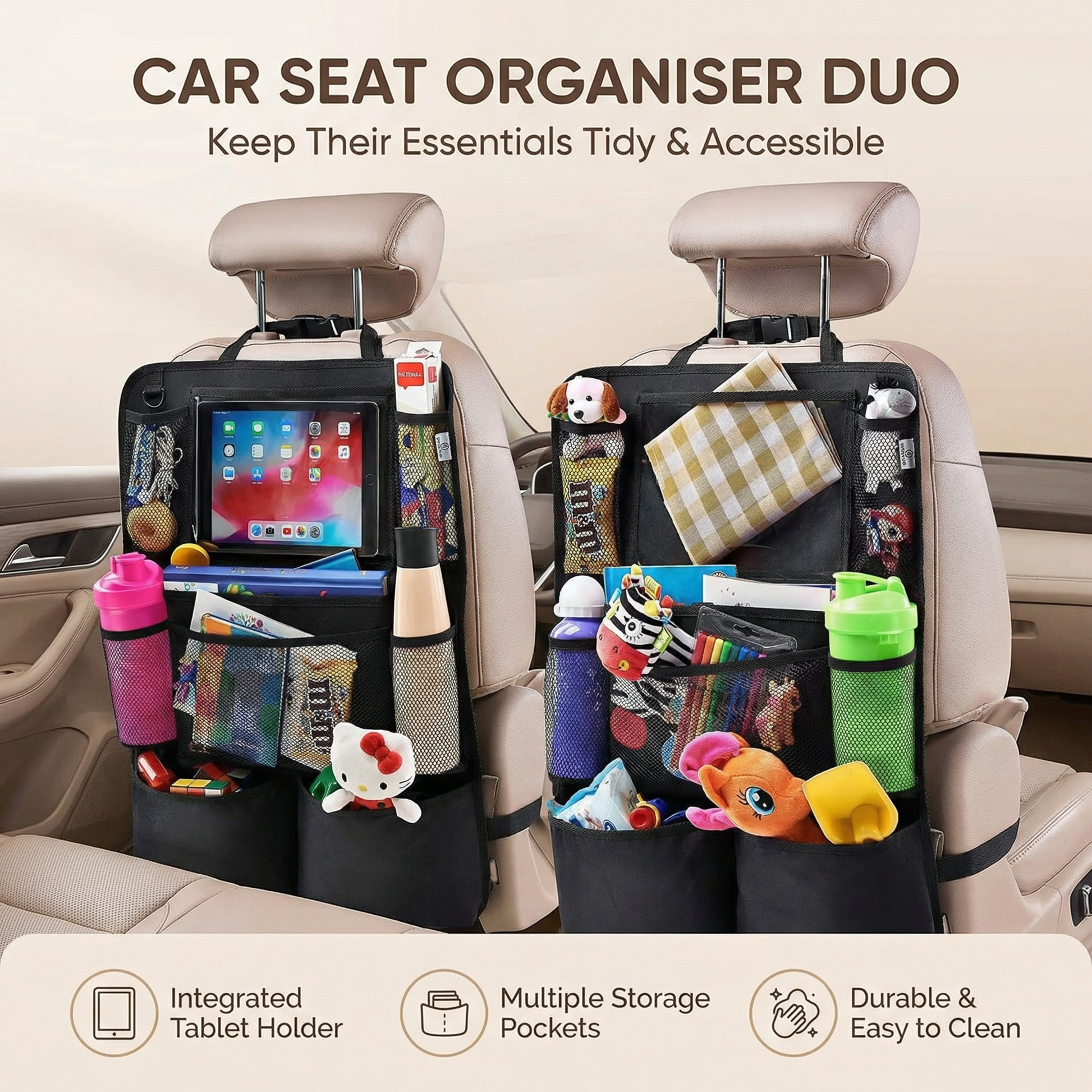 This kids car backseat organiser is designed to protect your seats while keeping travel essentials neatly stored and easy to reach. With multiple storage pockets and a built in tablet holder, it helps turn long journeys into calmer and more enjoyable experiences.
