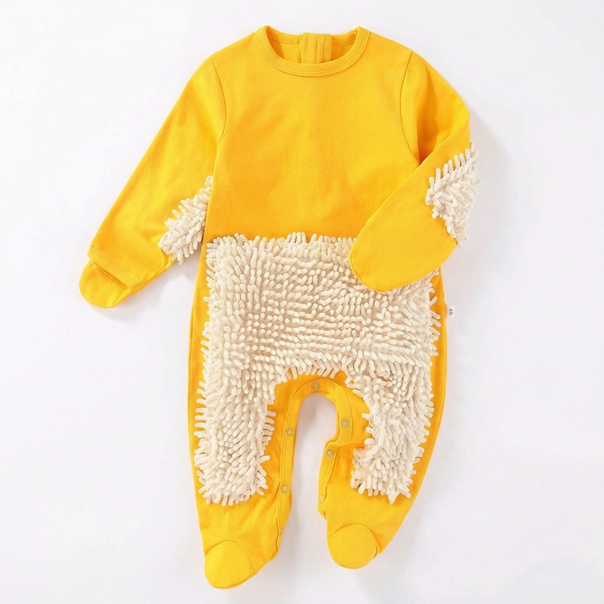 This playful baby crawling suit adds a fun twist to everyday playtime. Designed with soft mop-like fibres on the arms and legs, the suit gently picks up dust and small particles from the floor while babies crawl, roll and explore.