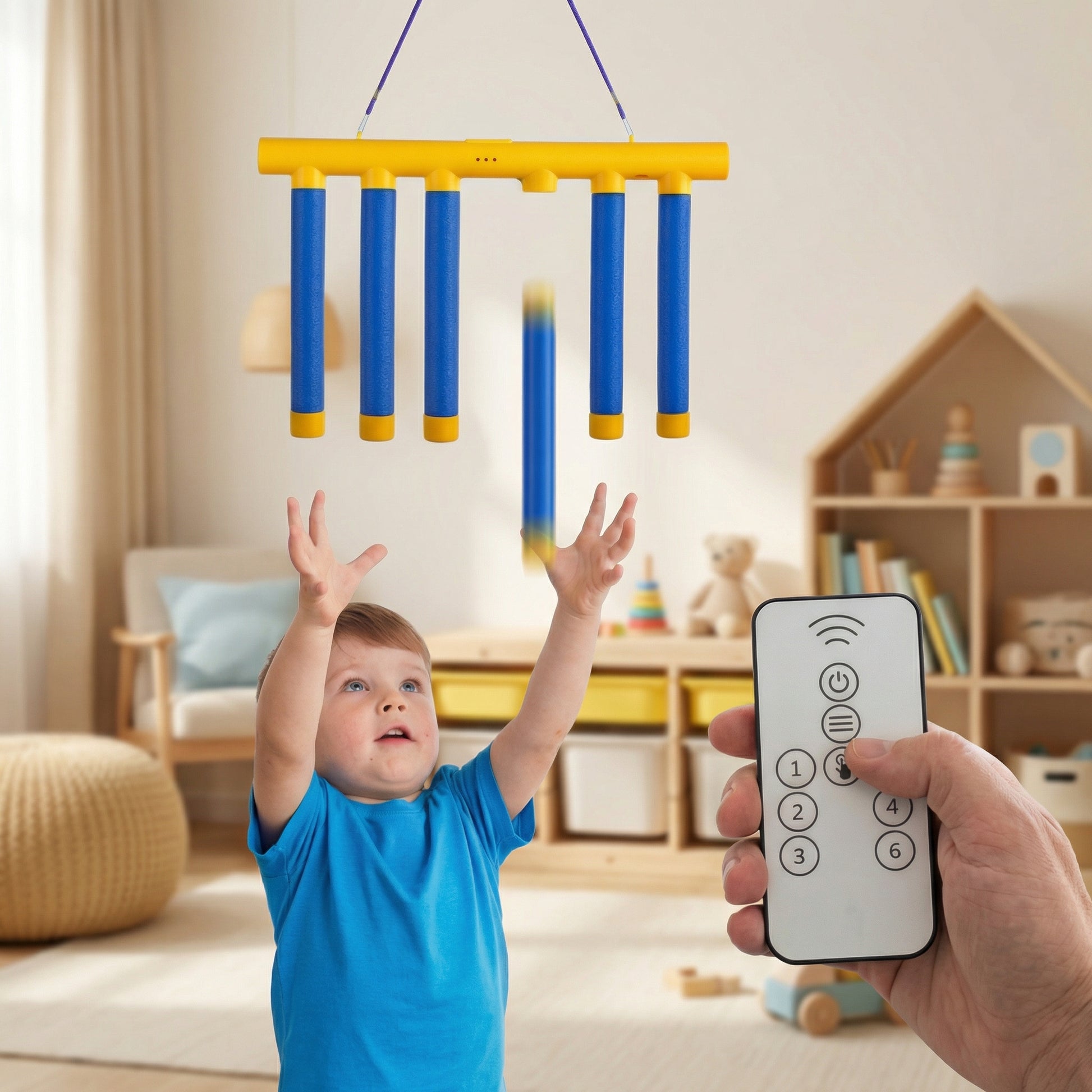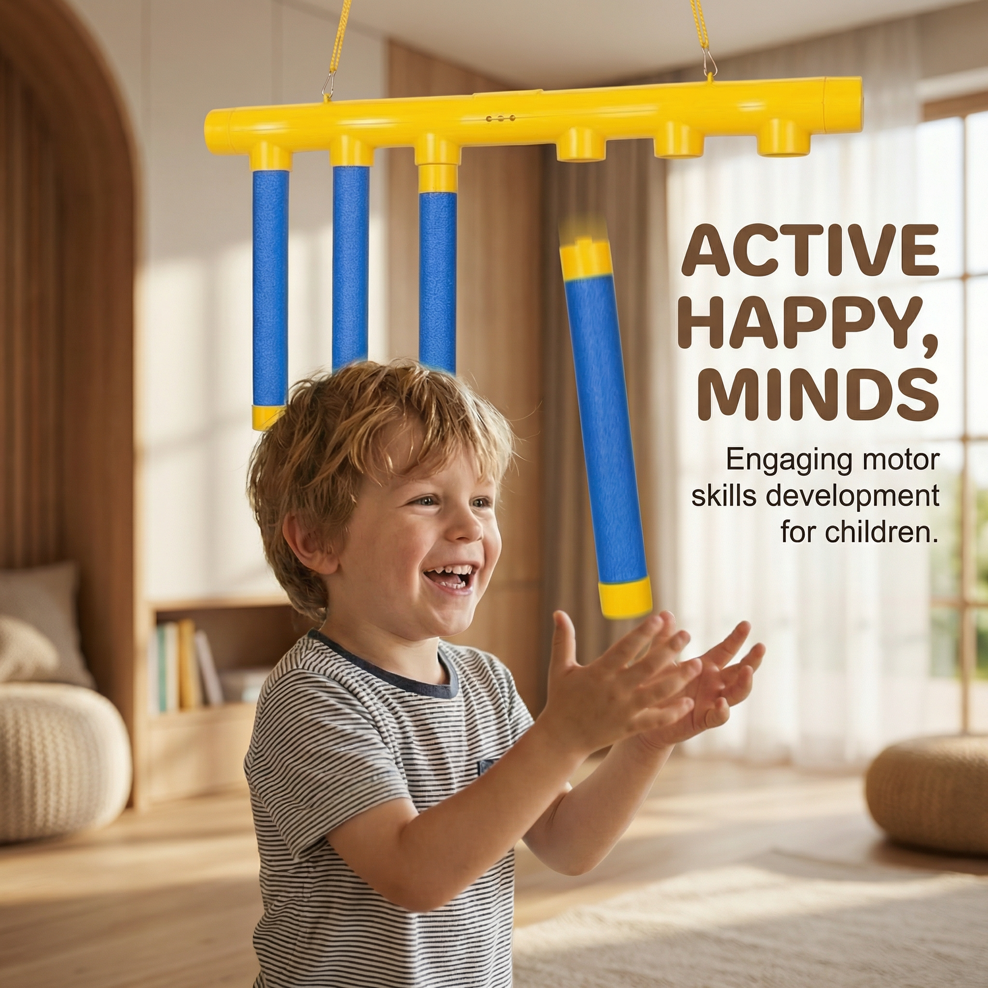 The sticks are released from above and fall at different speeds. Children must stay alert, react fast and catch them before they touch the floor.